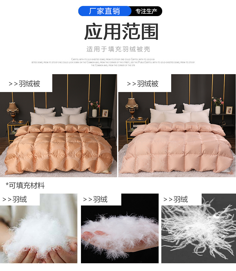 充絨機保持羽絨原油的柔軟性和彈性感。半自動操作,可根據特點調節充絨范圍,誤差小;操作簡單,節省人工成本,充絨在封閉箱內,確保生產現場環境整潔干凈。生產效率高,平均計量時間3-5秒。效率提高2倍以上,可靠性穩定性好。
